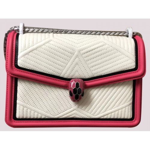 Schoudertas & quot;Serpenti Forever" met een "Framed Quilted" motief in nappa en heide amethist glad kalfsleer. Messing licht vergulde verleidelijke slangenkopsluiting in email, met ogen in onyx. Licht vergulde dikke ketting voor een dagkledinghouding. Klein formaat met één hoekplaat, één binnenzak met ritssluiting en één open binnenzak. Interne metalen tag met het Bvlgari-logo en zakspiegel.