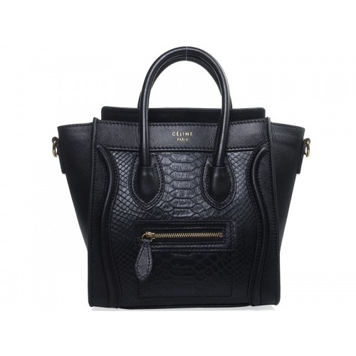 Celine Luggage Mini Tote in kalfsleer zwart met zwart slangenleer