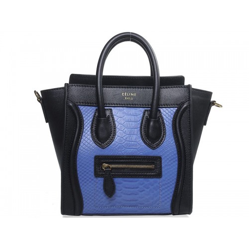 Celine Luggage Mini Tote in kalfsleer, zwart met blauw slangenleer