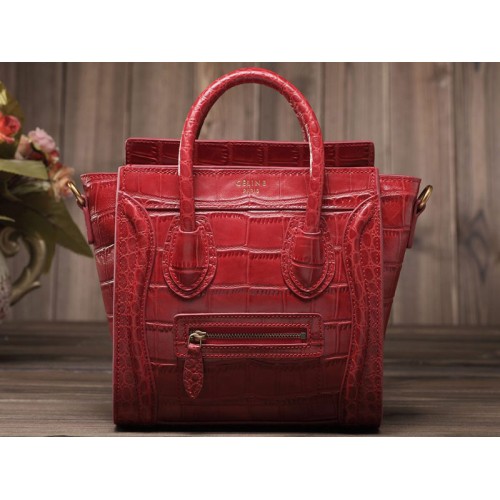 Celine Luggage Mini Tote in rood kalfsleer met rode krokodillenprint.