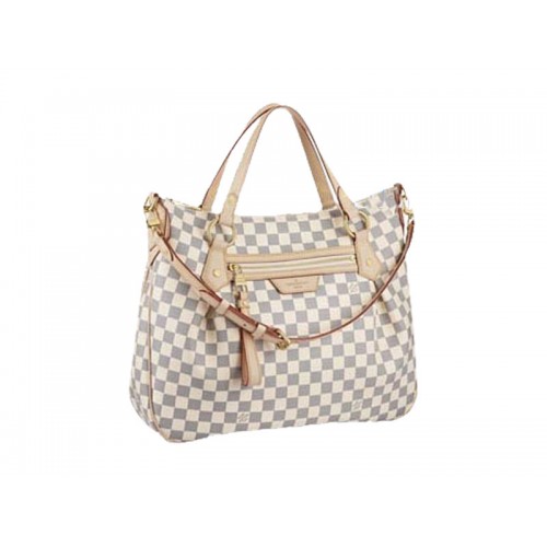 De Evora MM is verfijnd ruim en chic. Verfrissend Damier Azur Canvas accentueert zijn vrouwelijke gebogen vorm terwijl cowhide lederen garnituren en rijk gouden messing pure verfijning toevoegen.