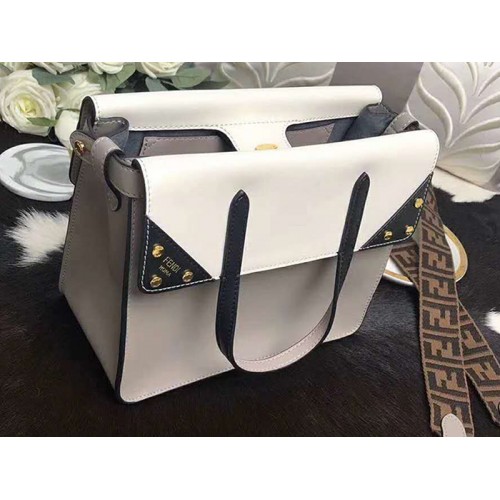 Zak met gemiddelde tote. Met de dubbele handgreep, met flap die aan de zijkanten vouwt, kunt u de tas met de hand dragen, of op de schouder of het cross-body dragen dankzij de afneembare schouderbanden. Voering met platte zak. Gemaakt van mix van beige en donkerblauwe kalfsleer. Versierd met micro platte studs. Lint schouderband met FF motief. Metaalwerk met gouden afwerking.