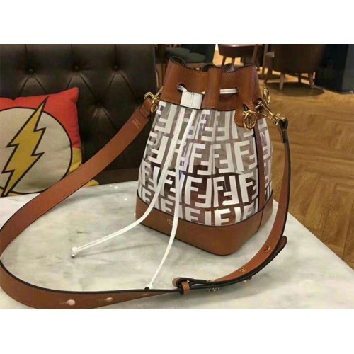 Mon Tresor bucket bag met trekkoord bevestiging en metalen decoraties in de Fendi logo vorm. Twee afneembare schouderbanden, één lang en één kort, om de tas met de hand over de schouder of het kruislichaam te dragen. Gemaakt van bruin kalfsleer. Iconisch FF patroon in verhoogde print en handgeschilderd in zwart. Goudafwerking metaalwaren.