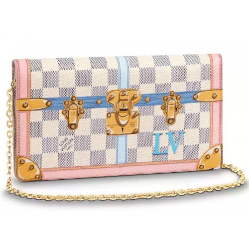 De Pochette Weekend-koppeling in het zomerse Damier Azur-canvas verwijst naar het reiserfgoed van Louis Vuitton met trompe-l'œ alle details die doen denken aan de iconische stammen. Stijlvol en veelzijdig, het kan worden omgevormd tot een kleine schoudertas dankzij de afneembare ketting. Deze speciale editie behoort tot de Trunk Summer 2018 collectie accessoires en lederwaren.