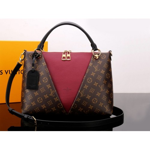 Voor herfst-winter 2018 wordt Monogram canvas gecombineerd met generfd leer in de V Tote MM handtas. Het beschikt over een voorpaneel van rundleer in een V-vorm, dat doet denken aan de initiaal van Vuitton, en dat een voorvak met ritssluiting verbergt. De goudkleurige hardware en LV gegraveerde handgreepbevestigingsringen voegen glans toe aan deze elegante en functionele tas.