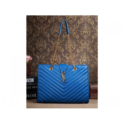 Klassieke Yves Saint Laurent Monogram Shopping Bag in koningsblauw Grain de Poudre gewatteerd leer.